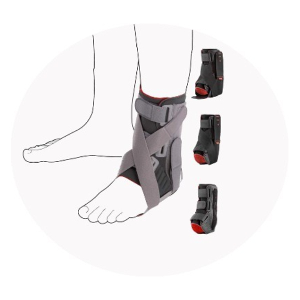 Конструкция включает в себя: пластиковый подошвенный модуль, обеспечивающий максимальную стабилизацию в остром периоде, голеностопный бандаж-основу, боковые усиливающие вставки (двух степеней жесткости), дополнительные фиксирующие ремни (несколько видов).