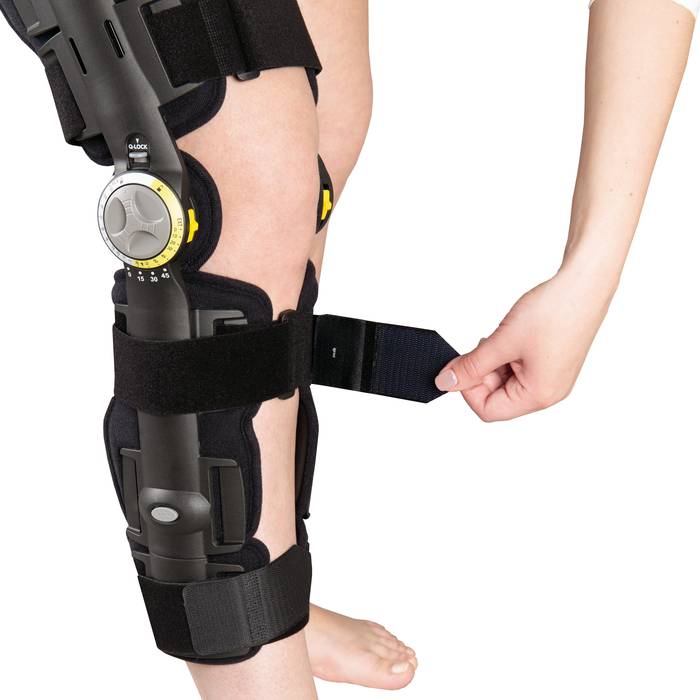 закрепите манжеты на голени и бедре с помощью застежек «Велкро» так, чтобы шарниры располагались по бокам коленного сустава