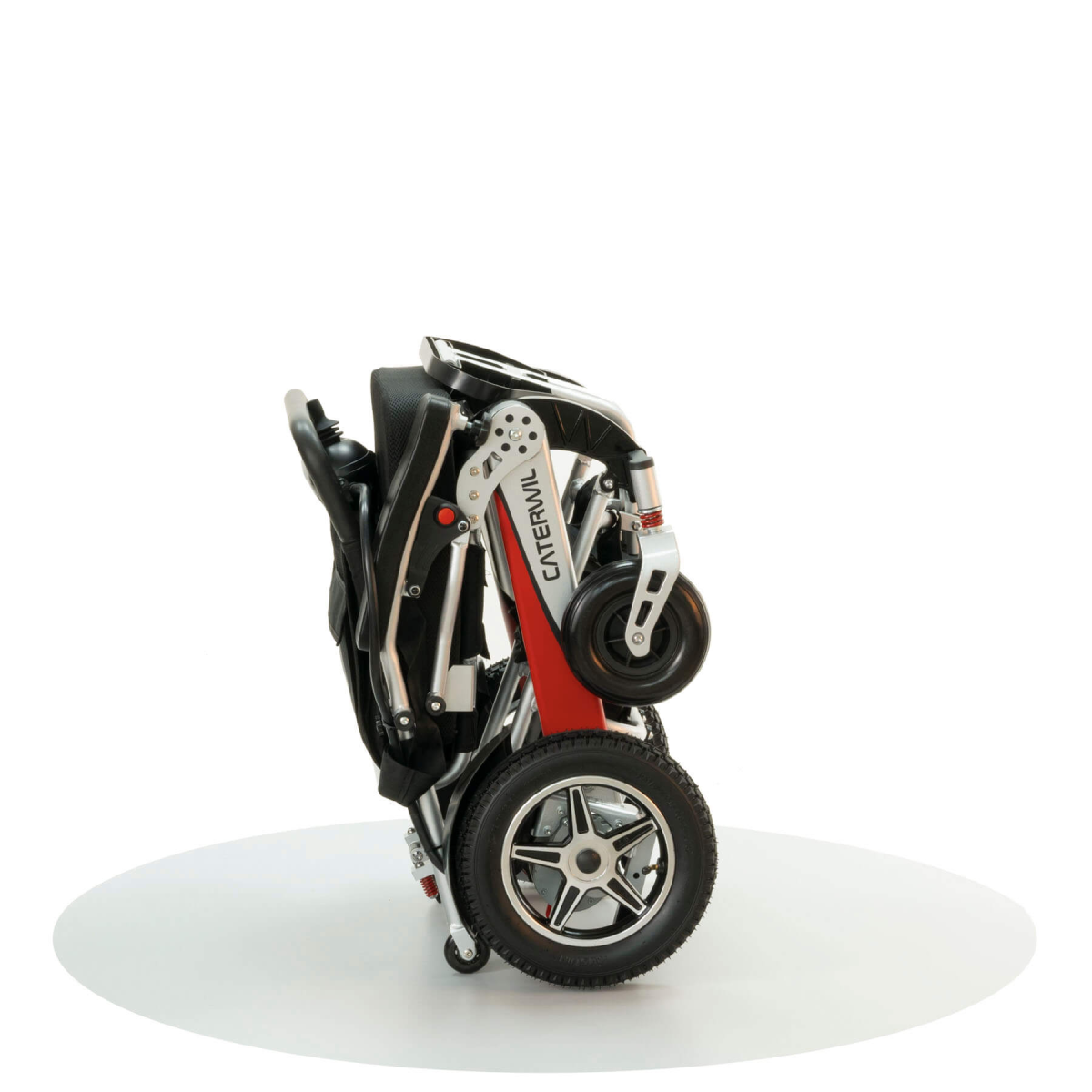 Основное преимущество данной электроколяски — это сверхлегкость и возможность складывания до размеров чемодана. Коляска оборудована 6-ю амортизаторами, литиевым аккумулятором, ремнем безопасности, пневматическими задними и мягкими цельнолитыми передними колесами из немаркой черной резины.