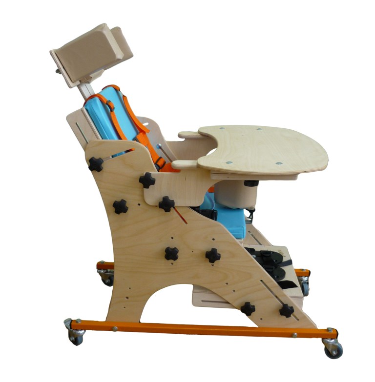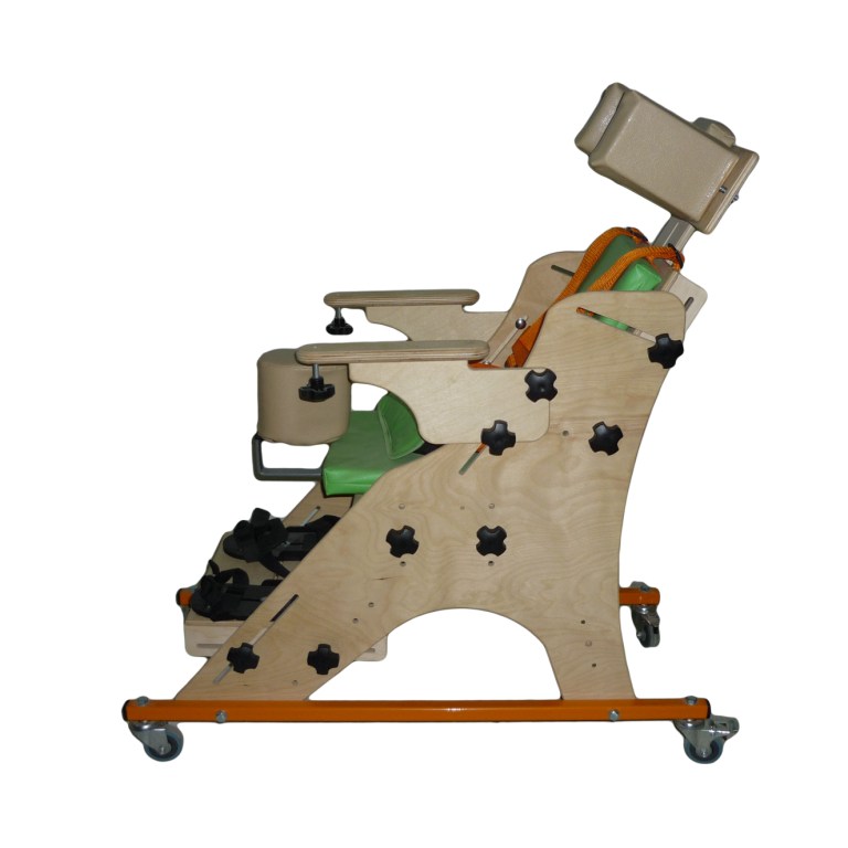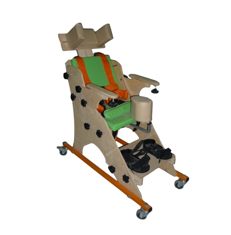 Ортопедическое кресло на деревянной раме, расположенной на металлическом четырехколесном основании.