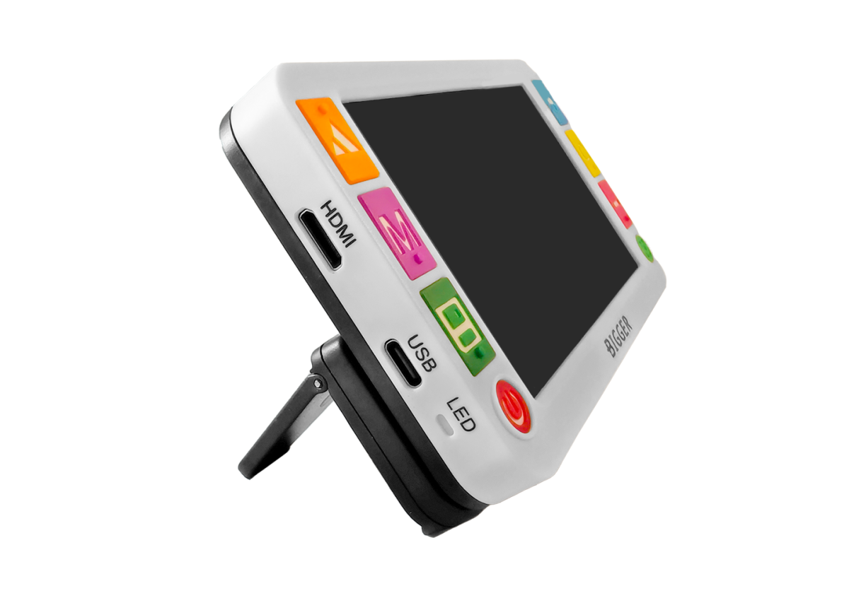 откидная подставка, делающая удобным использование электронного увеличителя как при чтении, так и письме;