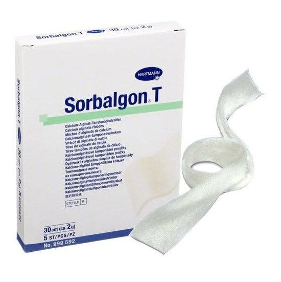 Тампонируемая в рану повязка SORBALGON/Сорбалгон из волокон кальция-альгината, которая, реагируя с солями натрия в крови и секрете, превращается в гидрофильный гель, заполняющий рану и не приклеивающийся к ней; благодаря этому возникают тесный контакт с раневой поверхностью и способствующая заживлению микросреда; в процессе гелеобразования микроорганизмы включаются в структуру геля.